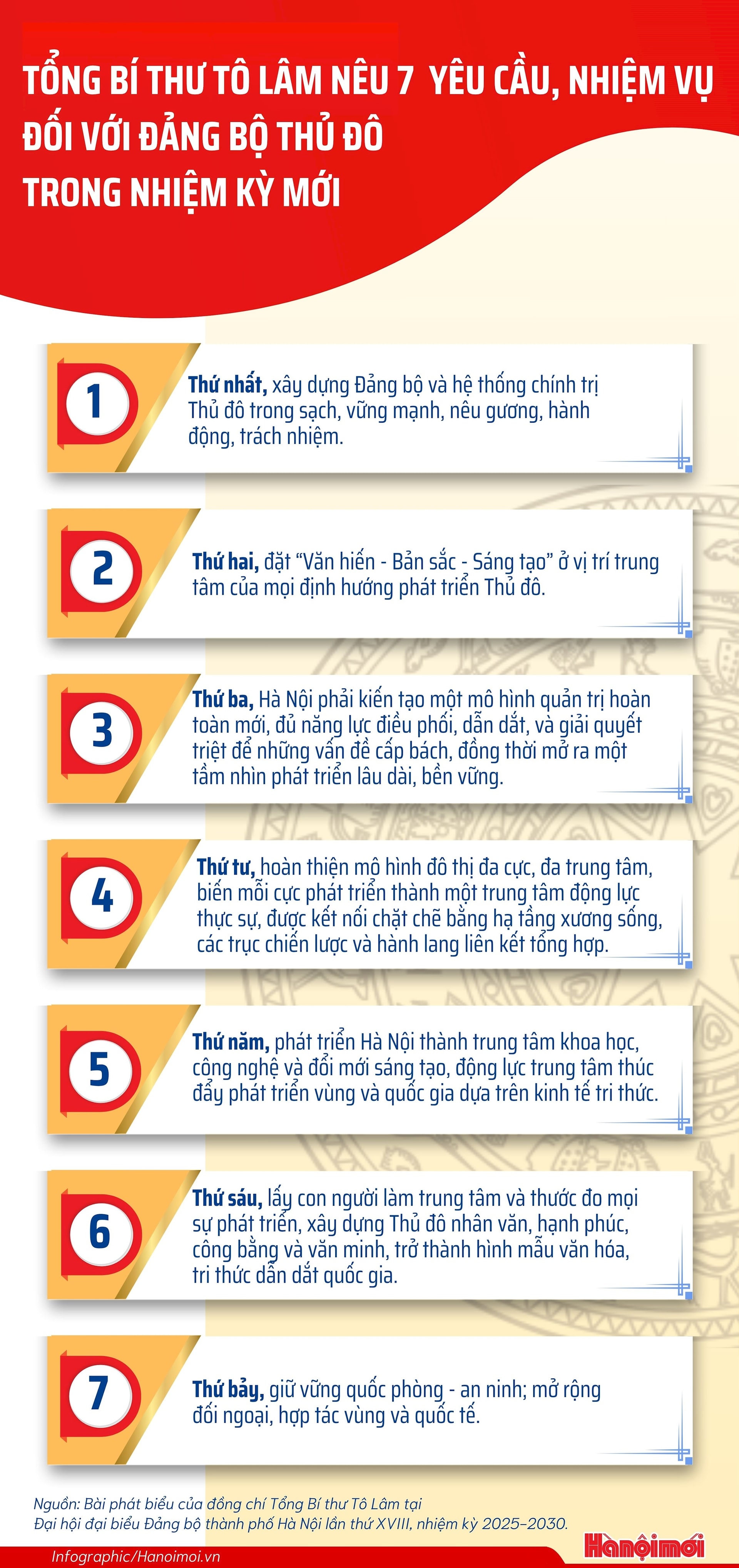 Sáng 16-10, Tổng Bí thư Tô Lâm đã dự và có bài phát biểu chỉ đạo quan trọng tại Đại hội đại biểu Đảng bộ thành phố Hà Nội lần thứ XVIII, nhiệm kỳ 2025-2030. Trong đó, đồng chí Tổng Bí thư gợi mở 7 yêu cầu, nhiệm vụ đối với Đảng bộ Thủ đô trong nhiệm kỳ mới.